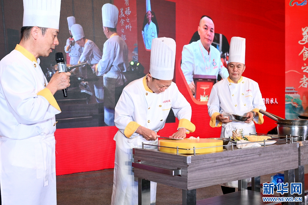 推介会设置了一个特殊的拜师收徒仪式。淮扬菜大师邓晨(右一)向国家级非遗传承人罗世伟(左一)正式拜师学习国宴名菜“佛跳墙”技艺。新华网发(主办方供图)