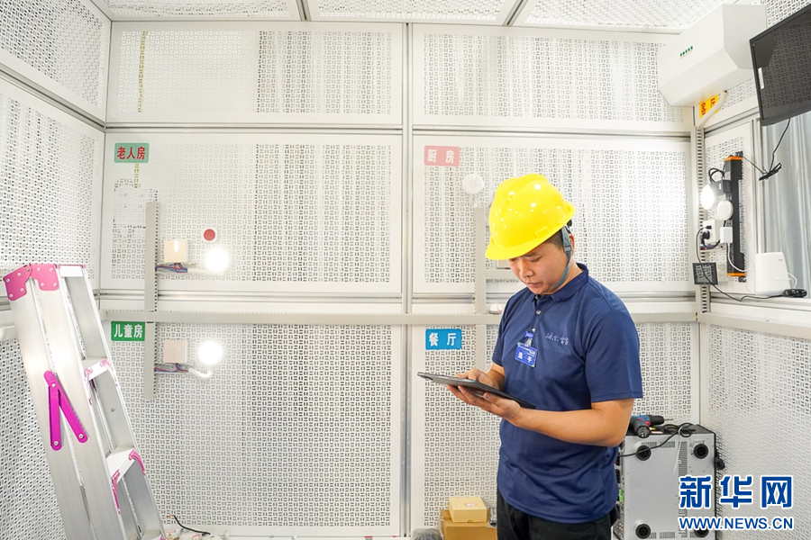 6月19日,选手在完成各项物联安装调试之后,对整个智能家居小屋进行检查。新华网 肖和勇 摄