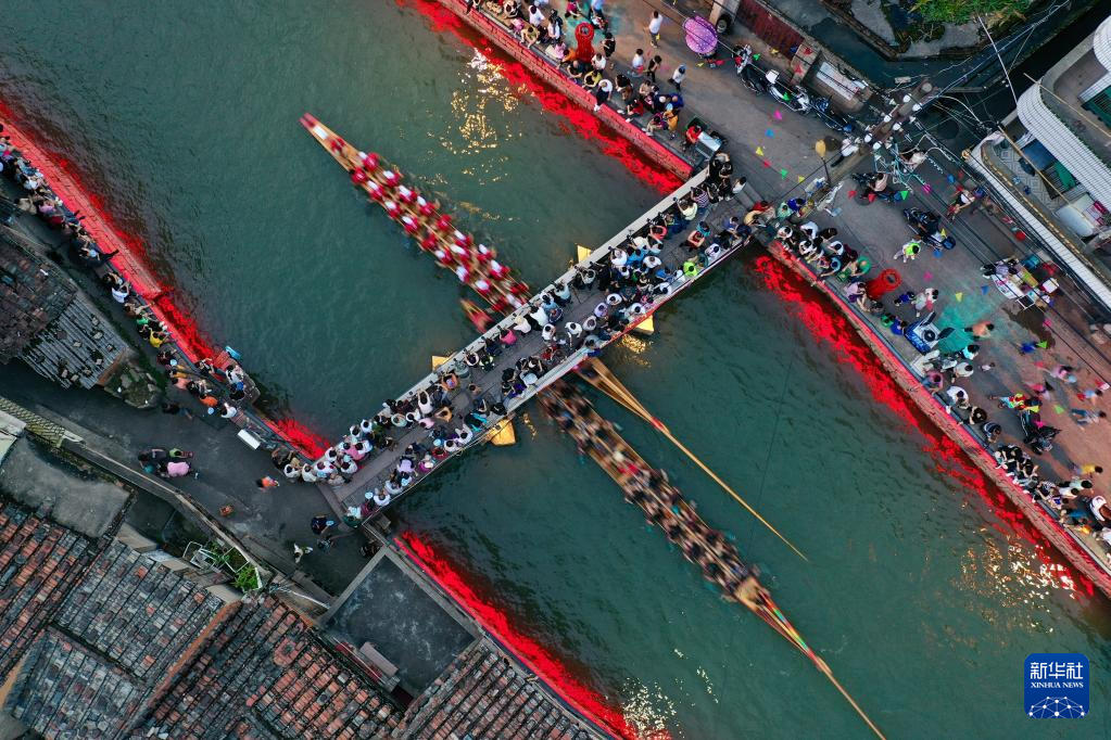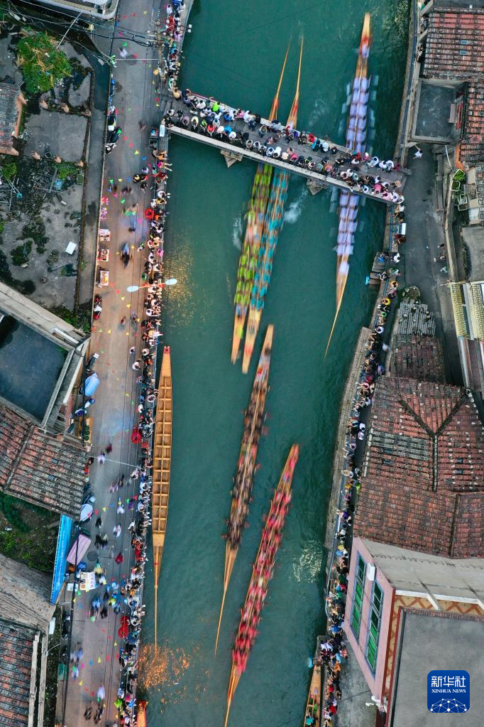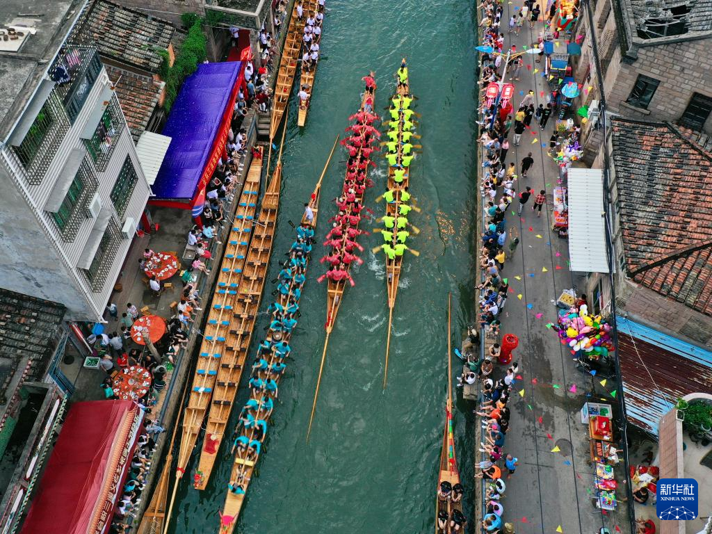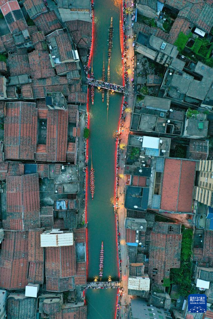 福州市长乐区三溪村,龙舟在穿村而过的小溪中竞渡迎端午(6月18日摄,无人机照片)。