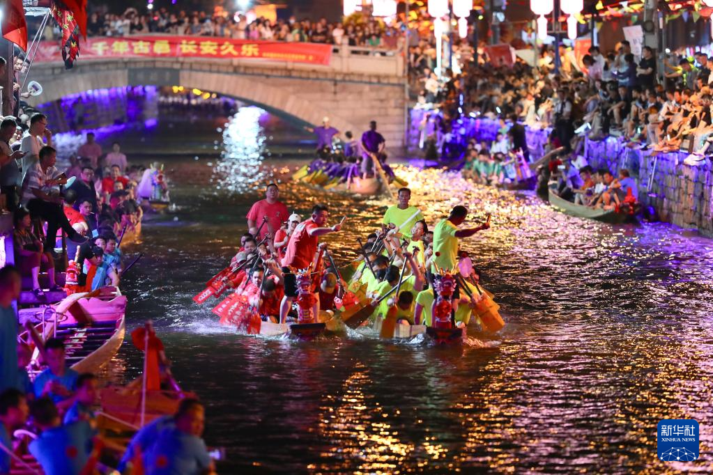 端午来临,福建省福州市长乐区三溪村独有的龙舟夜渡迎端午活动如约而至。夜幕降临,华灯初上,随着鼓声响起,数十条龙舟陆续出现在古村的小溪中,清澈的水面上船桨翻飞、龙舟飞驰,夹岸观众人头攒动,加油呐喊不绝于耳,一派热闹景象。夜赛龙舟习俗在三溪村已经沿袭600多年,每年端午节前后,村里的男女老少都会相聚一起夜竞龙舟,借此祈盼风调雨顺、平安健康。