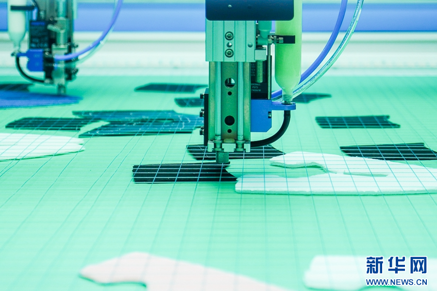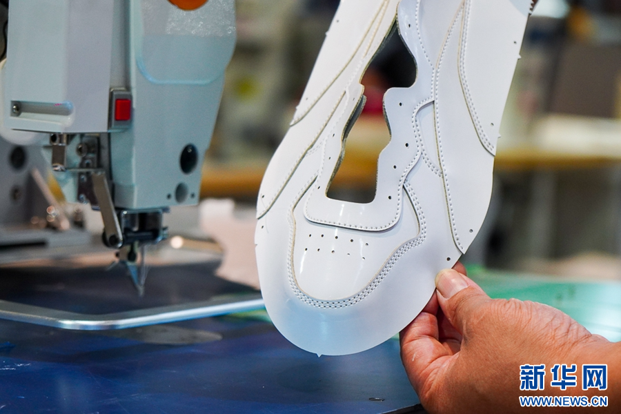 6月21日,鞋机设备展区,一家莆田本地展商展示智能针车现场做出来的鞋面。新华网 肖和勇 摄