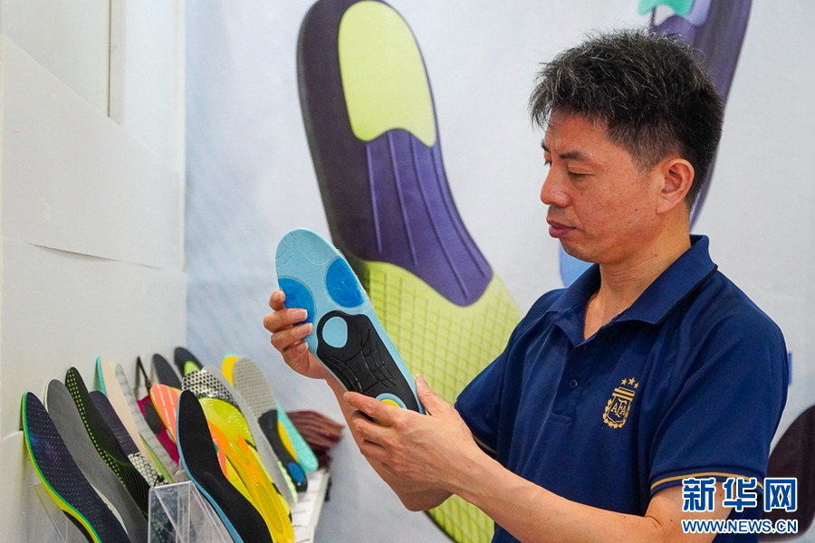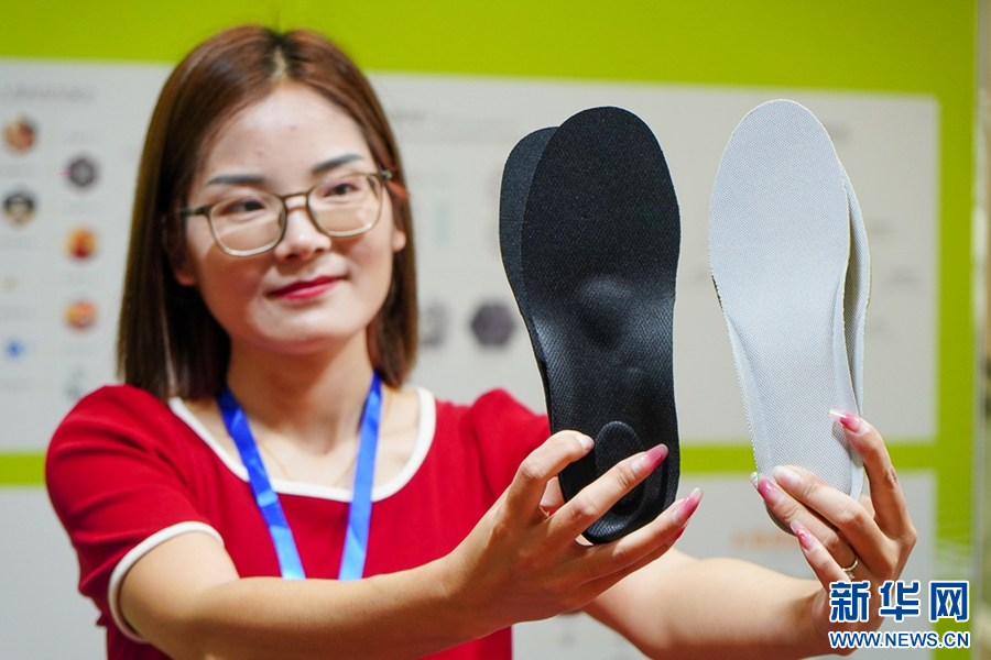 6月21日,鞋业新材料展区,一名莆田本地展商展示运动鞋垫。新华网 肖和勇 摄