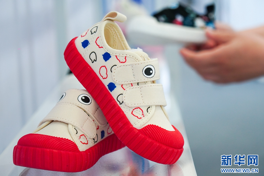 6月21日,“莆田鞋”自主品牌特装展区,游客在挑选童鞋。新华网 肖和勇 摄