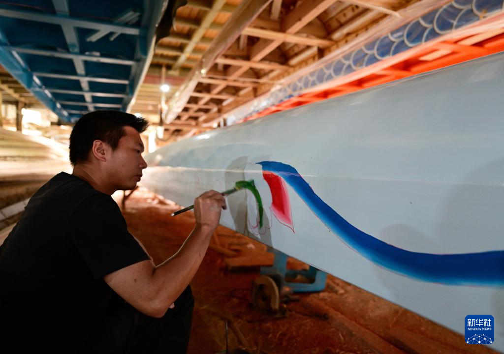 在福州市闽侯县方庄村“龙舟世家”方忠雄龙舟厂,一名龙舟画师为新龙舟画上花纹(5月23日摄)。新华社记者 魏培全 摄