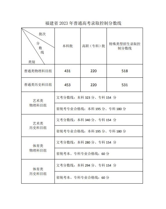 6月24日下午,福建省高等学校招生委员会召开全体会议,研究确定我省2023年普通高考切线方案,部署高招录取工作。经会议研究决定,福建省2023年普通高考各类录取控制分数线具体如下: