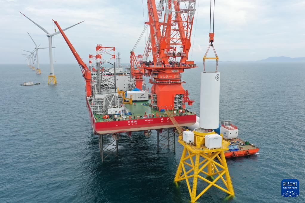 6月24日拍摄的16兆瓦大容量海上风电机组安装现场(无人机照片)。 新华社记者 林善传 摄