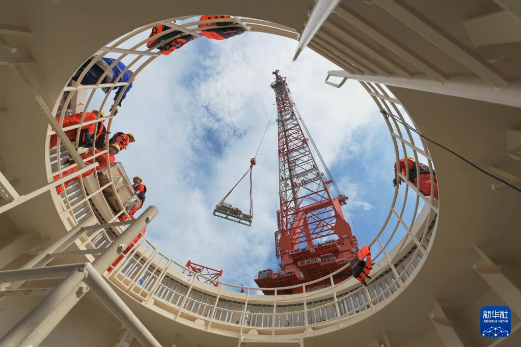 6月24日,施工人员在“白鹤滩”号海上风电安装平台上吊装塔筒(无人机照片)。 新华社记者 林善传 摄