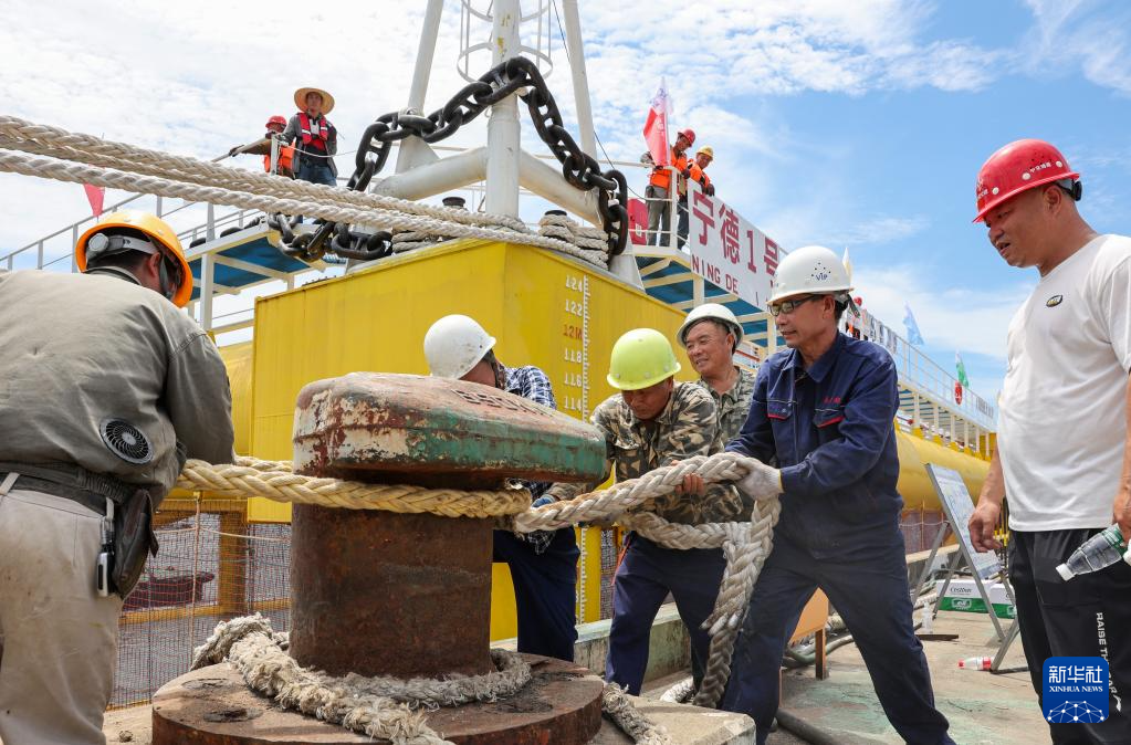 6月27日,作业人员施放“宁德1号”锚定缆绳,准备拖航。