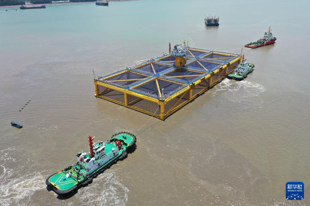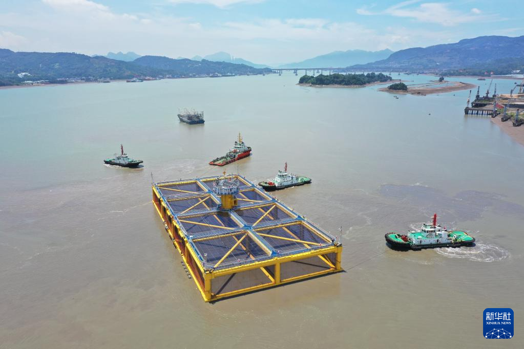 6月27日,在福建福安白马江上,拖船牵引深远海养殖平台“宁德1号”出海(无人机照片)。新华社发(王志凌摄)