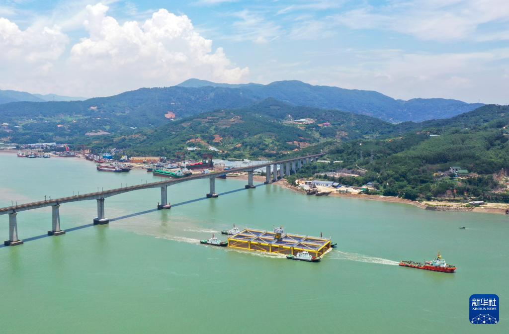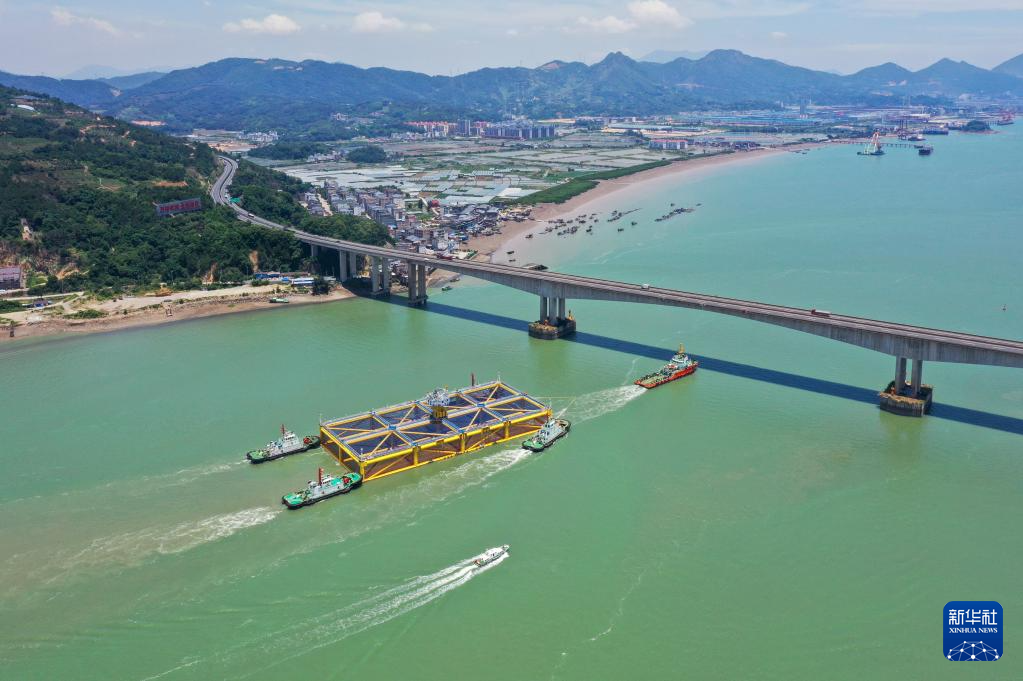 6月27日,深远海养殖平台“宁德1号”在拖轮协助下通过沈海高速下白石特大桥(无人机照片)。新华社发(王志凌摄)
