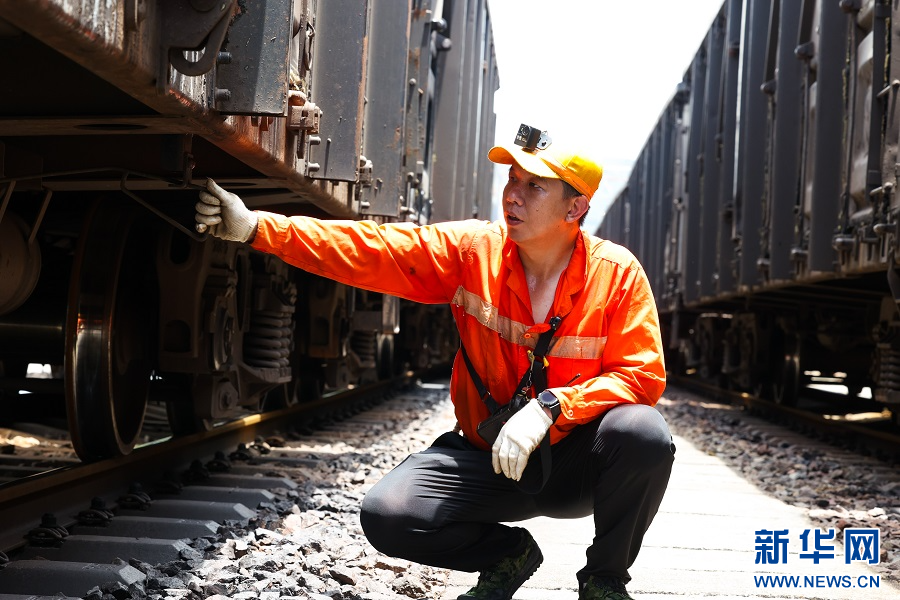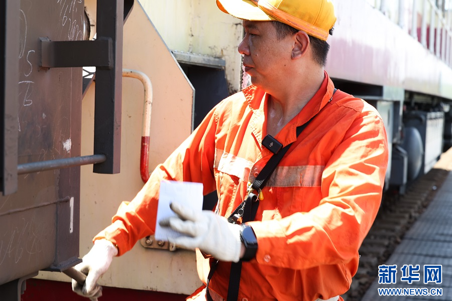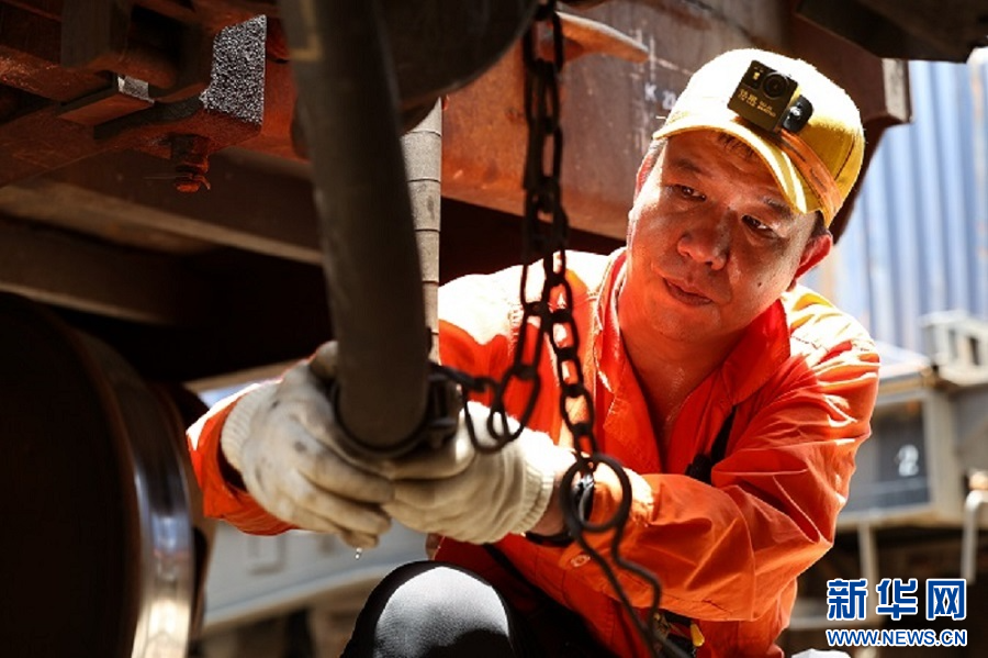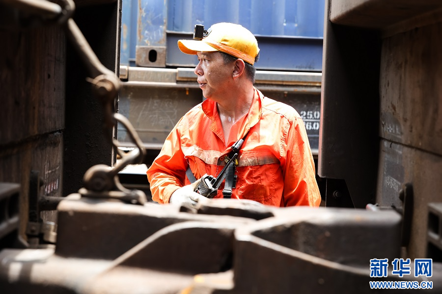 樟林火车站调车员郭榕辉汗流浃背穿梭在车辆间。新华网发(王勇富 摄)