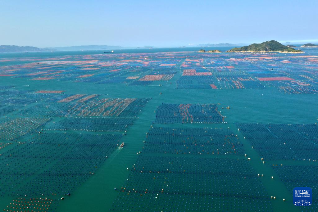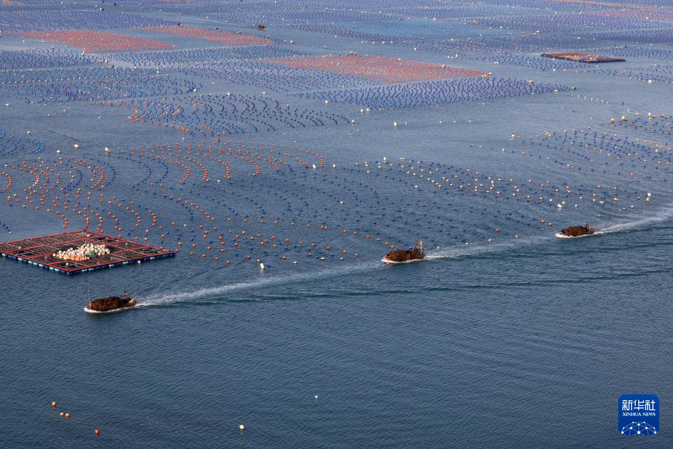 7月11日,在连江县下宫镇松芦湾海域,渔民驾驶渔船穿梭在海上牧场(无人机照片)。新华社发(王旺旺摄)