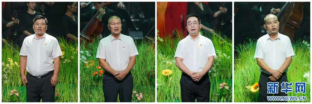 7月17日晚上,来自基层的村干部巩保雄(左一)、高泉伟(左二)、俞小平(右二)和施金通(右一)走上舞台,深情讲述《新时代——我做乡村振兴答卷人》。新华网 肖和勇 摄