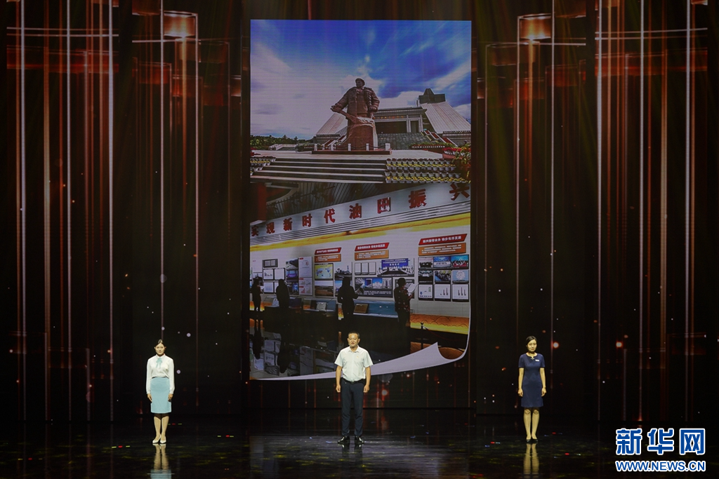 7月17日晚上,红色纪念馆讲解员吴丽丽(左)、王立志(中)、程珺喆(右)在讲述《我爱你中国》。新华网 肖和勇 摄