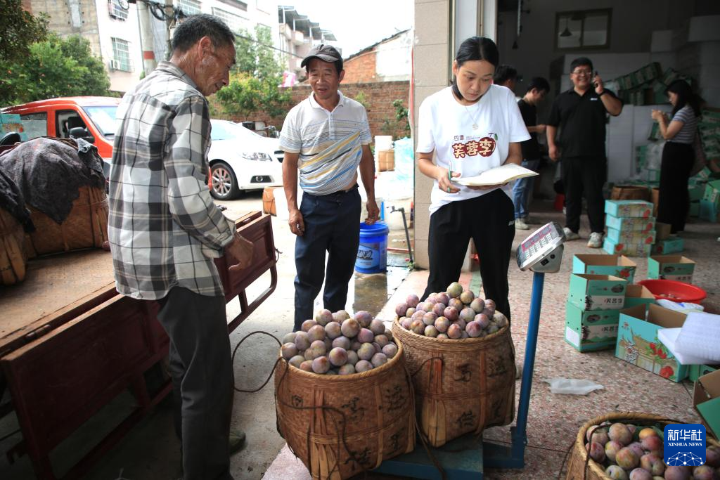 7月21日,在连城县四堡镇双泉村配送中心,果农将采摘的芙蓉李称重。新华社发(周杨东 摄)