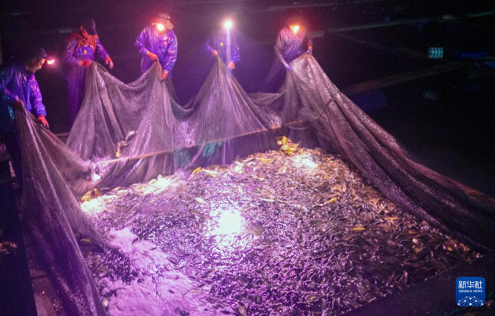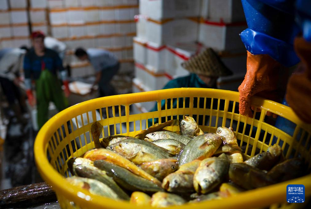 在宁德霞浦下浒海域渔排上拍摄的养殖户夜捕的大黄鱼(2021年11月25日摄)。新华社发(王志凌摄)