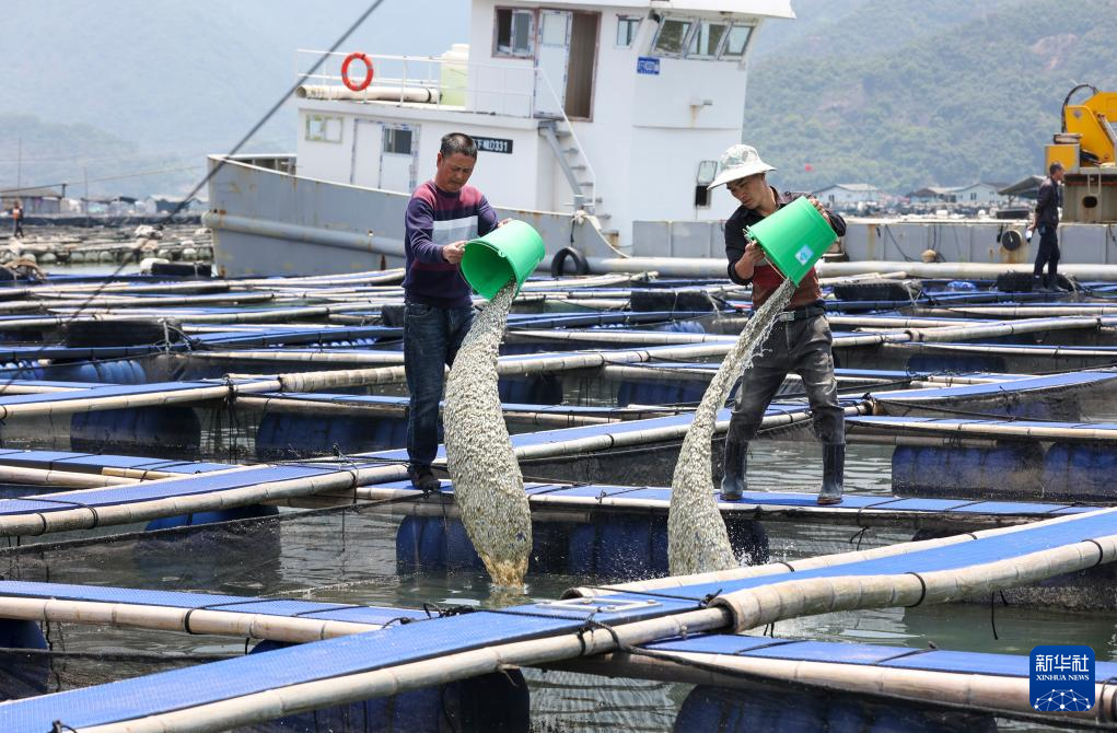 养殖户在宁德三都澳东冲口海域投放大黄鱼鱼苗(5月9日摄)。新华社发(王志凌摄)