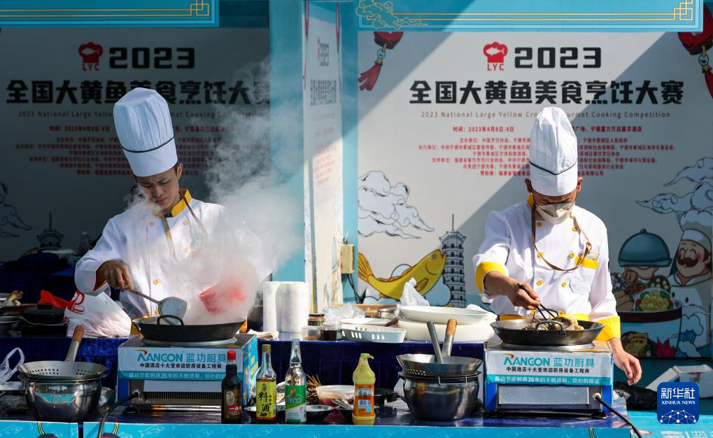 厨师在宁德首届全国大黄鱼美食烹饪大赛上烹饪大黄鱼(4月9日摄)。新华社发(王志凌摄)