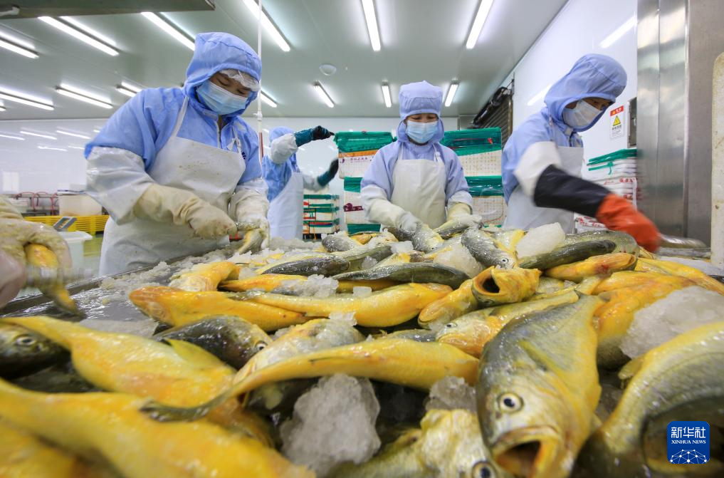 在宁德金盛水产生产车间,工人们加工大黄鱼产品。这里每天大黄鱼加工量达1.5至2万尾(5月12日摄)。新华社发(王志凌摄)