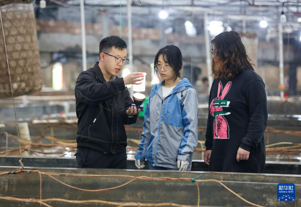 在宁德泩泩渔业育苗场,厦门大学徐鹏教授团队驻场博士(中、右)向育苗场负责人了解大黄鱼实验苗培养情况(5月9日摄)。一代又一代人的科技接力,让大黄鱼越“游”越强健。新华社发(王志凌摄)