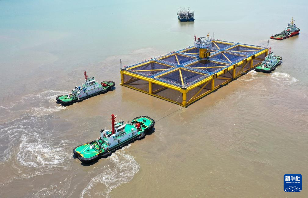 宁德制造的大黄鱼深海养殖平台“宁德1号”拖航出海,驶向霞浦北礵岛海域养殖区(无人机照片,6月27日摄)。该平台装配自动投喂、气温海水监测、信息化自动控制等先进系统,将引领宁德大黄鱼养殖由内澳走向深海。新华社发(王志凌摄)