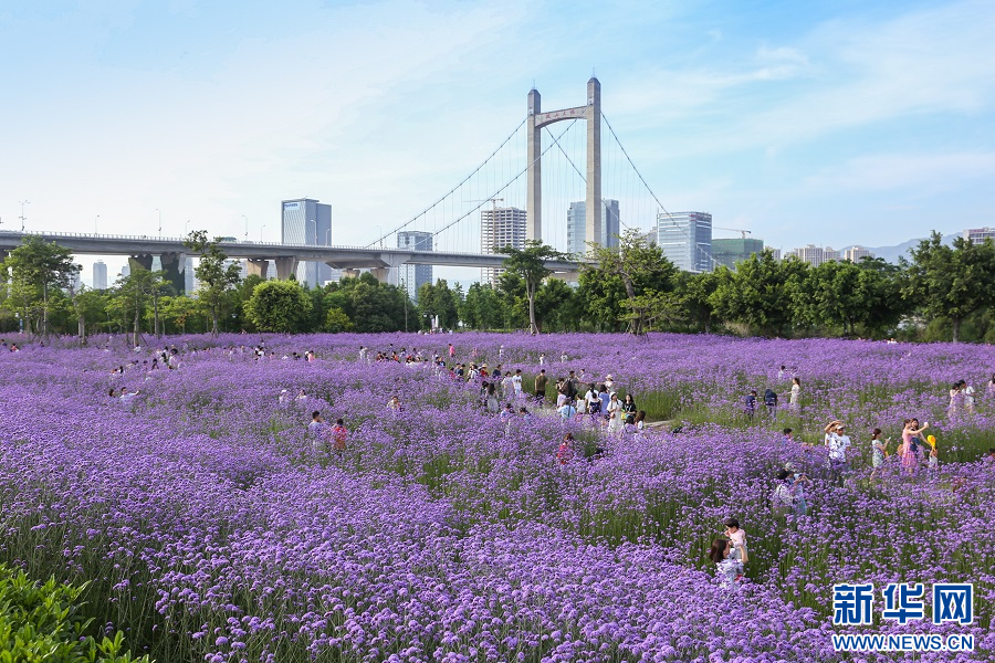 在福建福州,花海公园四季有花。图为市民徜徉在紫色的花海中。新华网 蒋巧玲 摄
