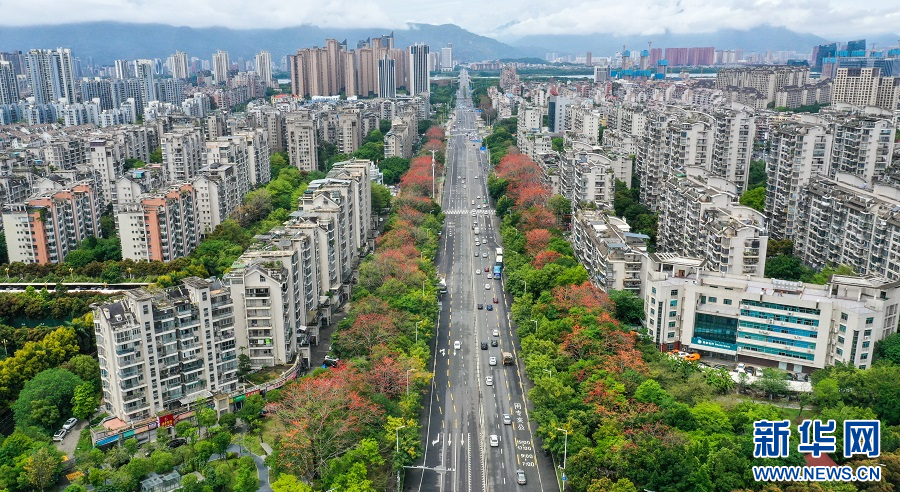 福州金山大道上,盛开的木棉花为城市景观增添了一份色彩。新华网 肖和勇 摄