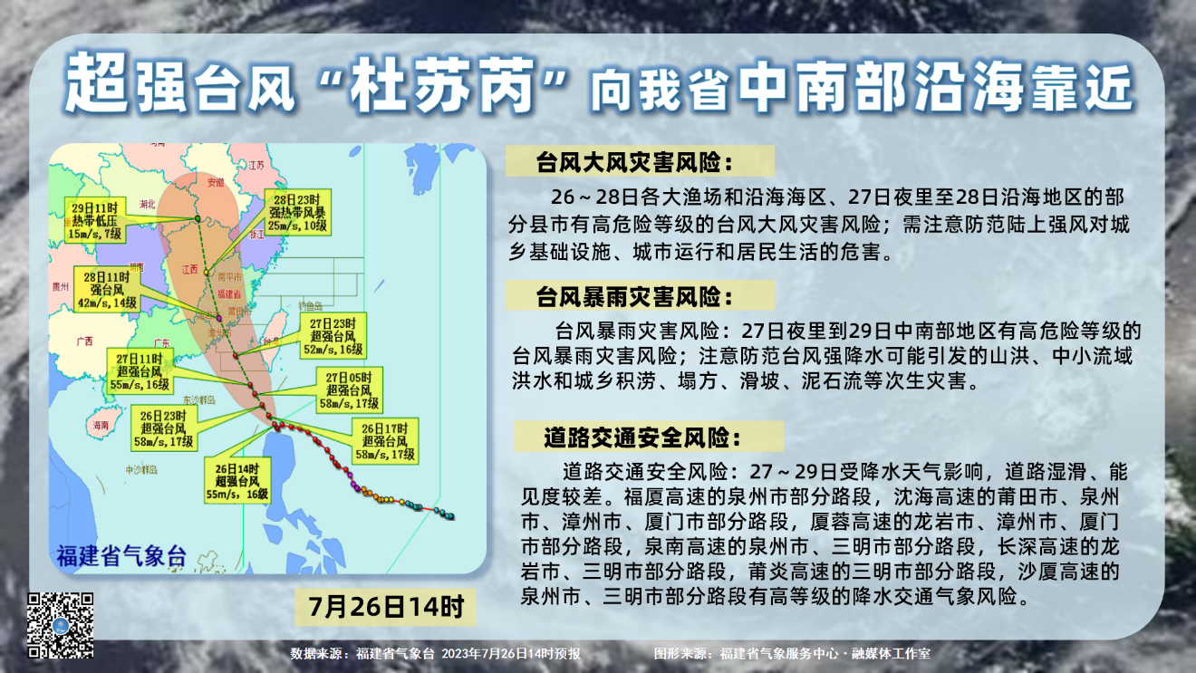 今年第5号台风“杜苏芮”中心7月26日11时距离台湾省鹅銮鼻偏南方向约325公里,距离福建省海岸线约670公里。气象部门预测,“杜苏芮”或在闽南沿海登陆,且致灾性强。面对步步紧逼的台风,福建各方严阵以待。