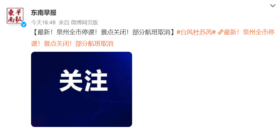 厦门、漳州、福州、泉州等地发布停课通知。