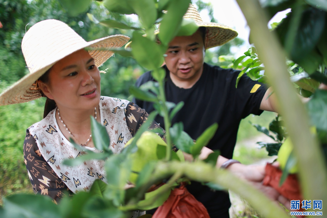 琯溪蜜柚丰收在即,台风来袭,极可能将满挂柚果的枝条刮断,或将枝头的柚果刮落。漳州市气象局特派团队深入平和安厚镇蜜柚基地,指导柚农抓紧时间对蜜柚果树进行加固,尽量把台风可能带来的损失降低。新华网发(卢达鹏 摄)