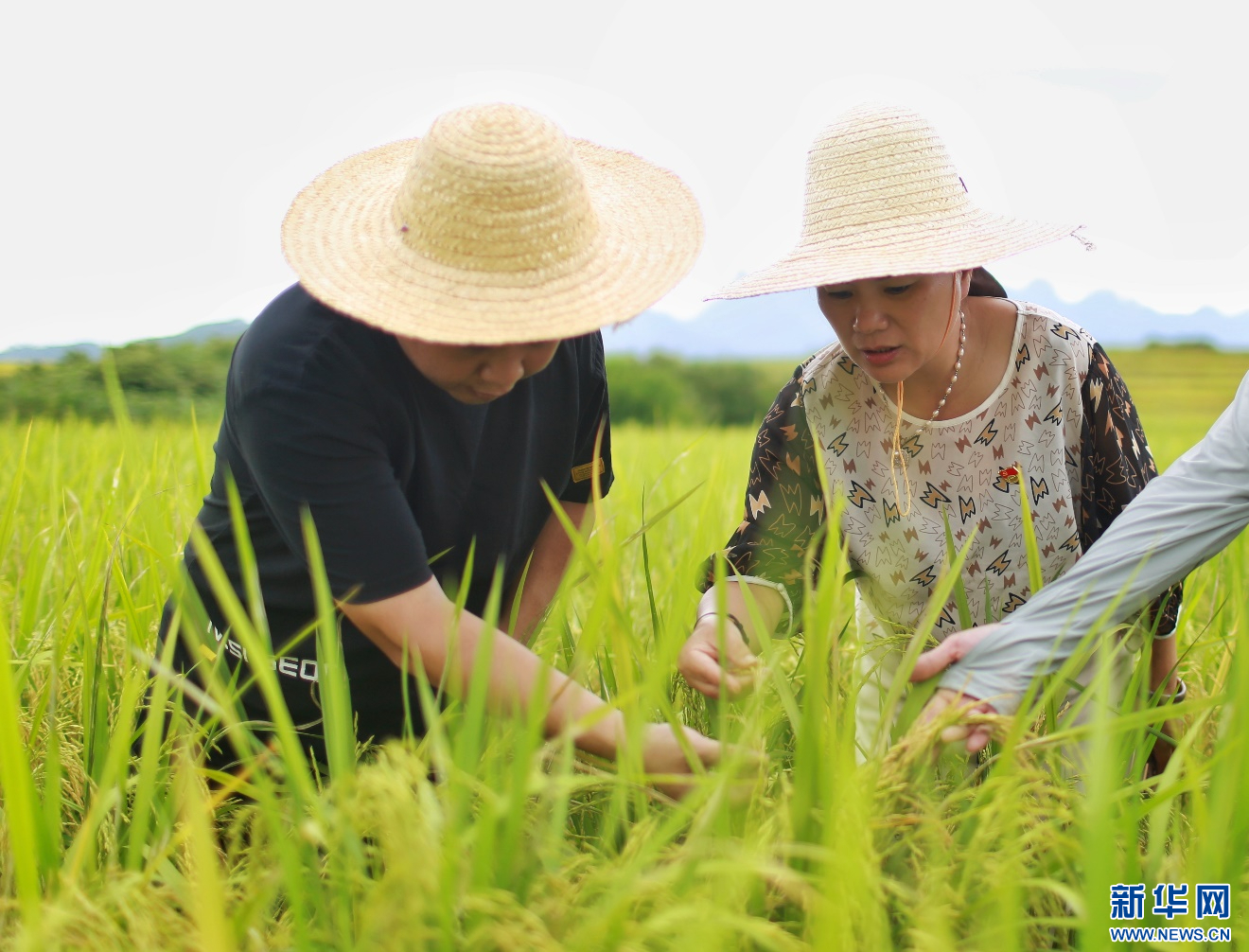 漳州市气象局特派团队深入平和安厚镇100亩水稻基地,建议立即抢收成熟水稻,对离成熟期比较长时间的稻田,在附近加强清沟排水工作,争取把损失降到最低。新华网发(卢达鹏 摄)