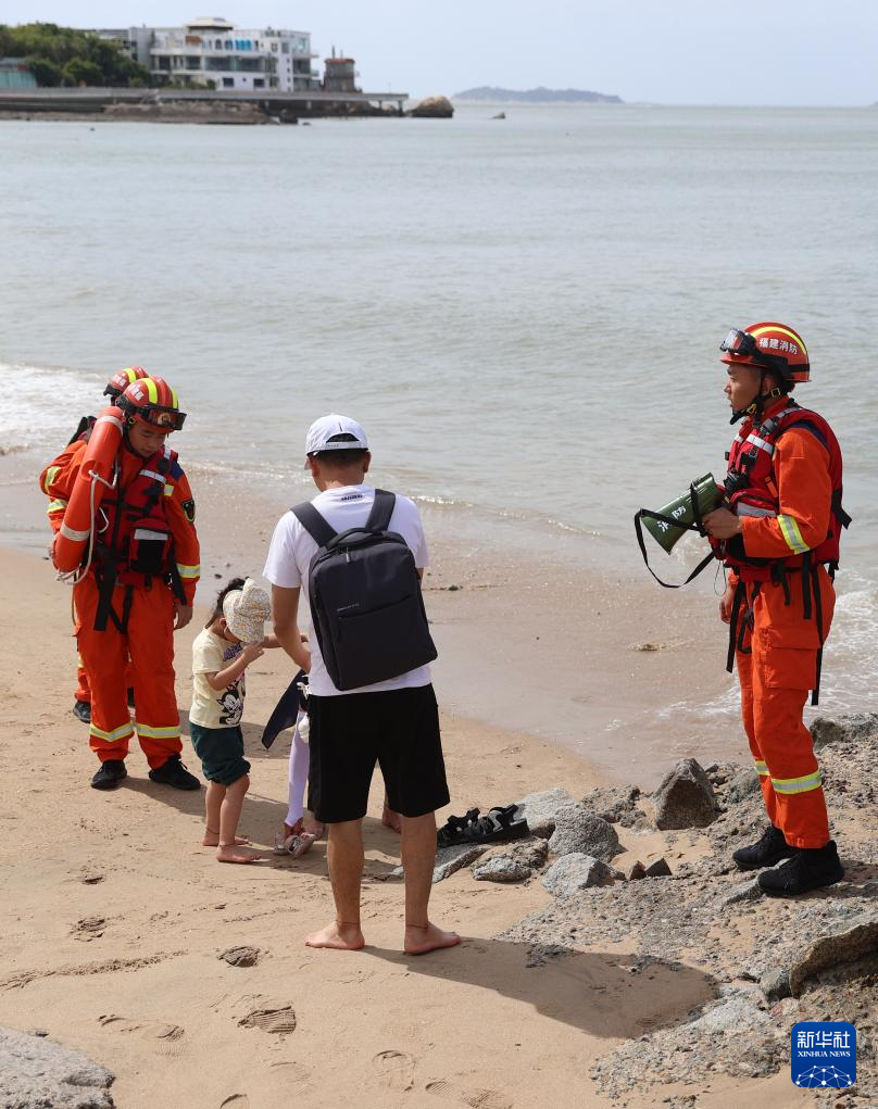 7月27日,福建省厦门市思明区厦港消防救援站消防员在厦门环岛路海边对游客进行劝离。新华社发(曾德猛摄)
