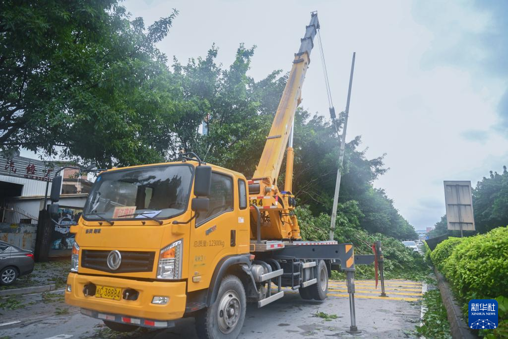 7月28日,台风过后,在福建省泉州晋江市区,抢修车辆在清理被折断的电线杆和树木。新华社记者 周义 摄