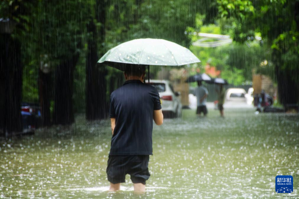 7月29日,位于福州市福新路上的某小区积水严重,一名市民涉水回家。