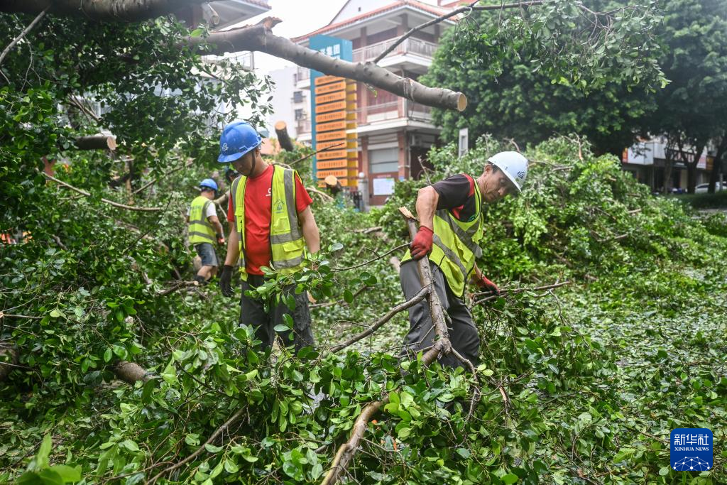 7月29日,在福建泉州市区,市政人员清理倒伏在主干道的树木。新华社记者 周义 摄