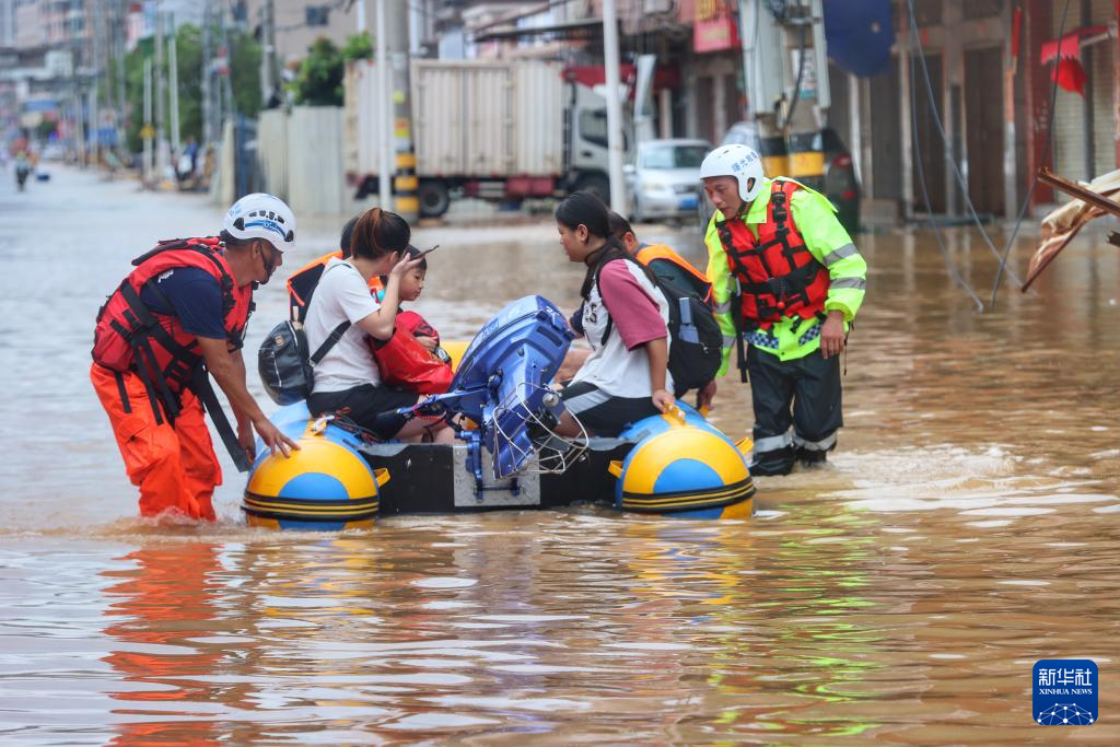 7月29日,在福建泉州南安市,来自民间的救援力量用橡皮艇转移受困群众。