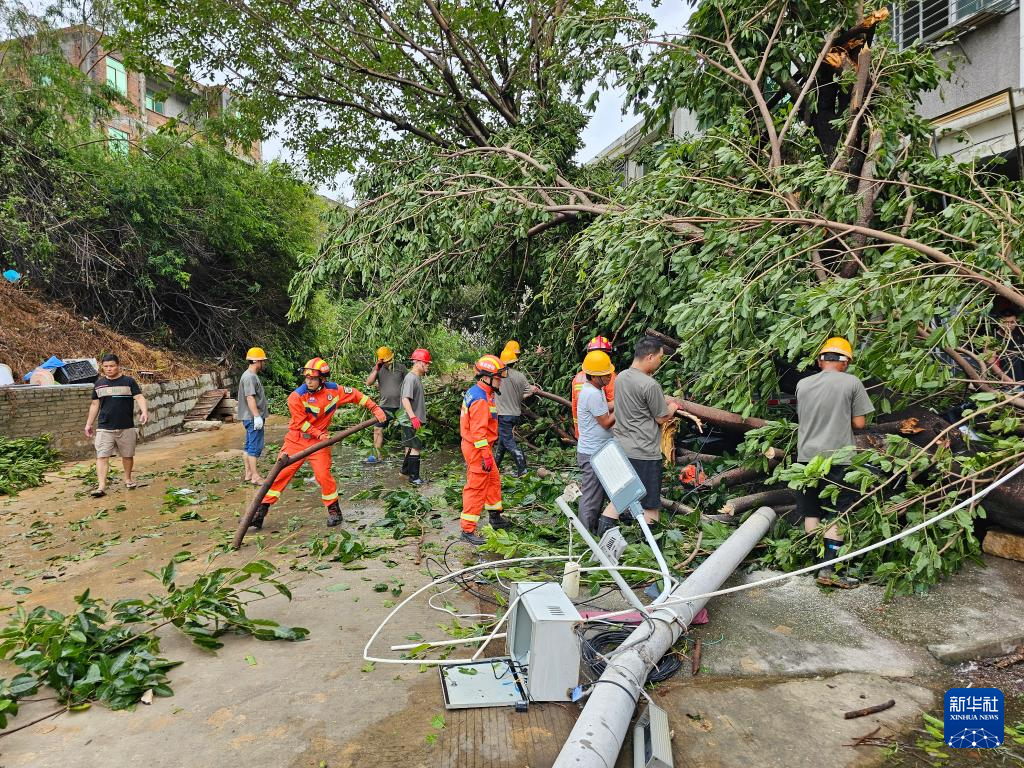 7月29日,在福建泉州惠安县螺阳镇东风村,消防救援等力量清理居民楼前倒伏的树木。新华社发