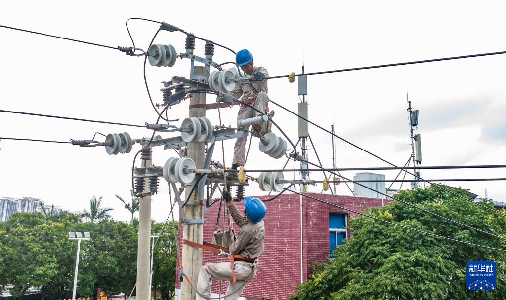 7月29日,在福建泉州肖厝社区,国网泉州供电公司抢修人员抓紧抢修居民用电受损线路(无人机照片)。新华社记者 周义 摄