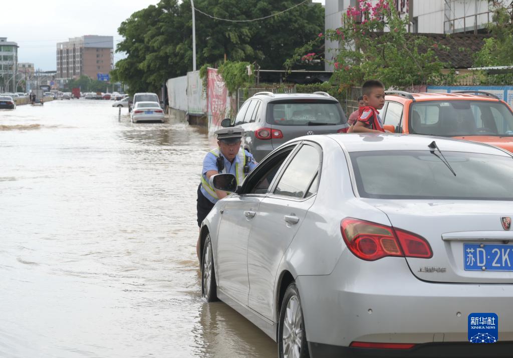 7月29日,在莆田市涵江区,交警将被困车辆推出涉水路段。新华社记者 郭圻 摄