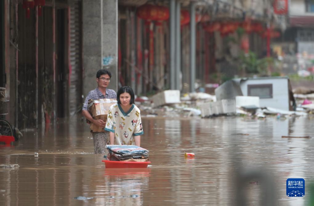 7月29日,莆田市涵江区江口镇龙津街的居民在水中转移物资。新华社记者 吴剑锋 摄
