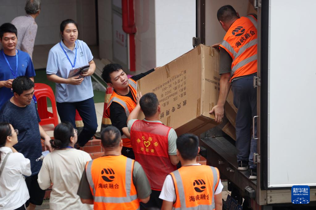 7月29日,在福建省厦门市新圩学校临时安置点,志愿者在搬运物资。新华社发(曾德猛 摄)