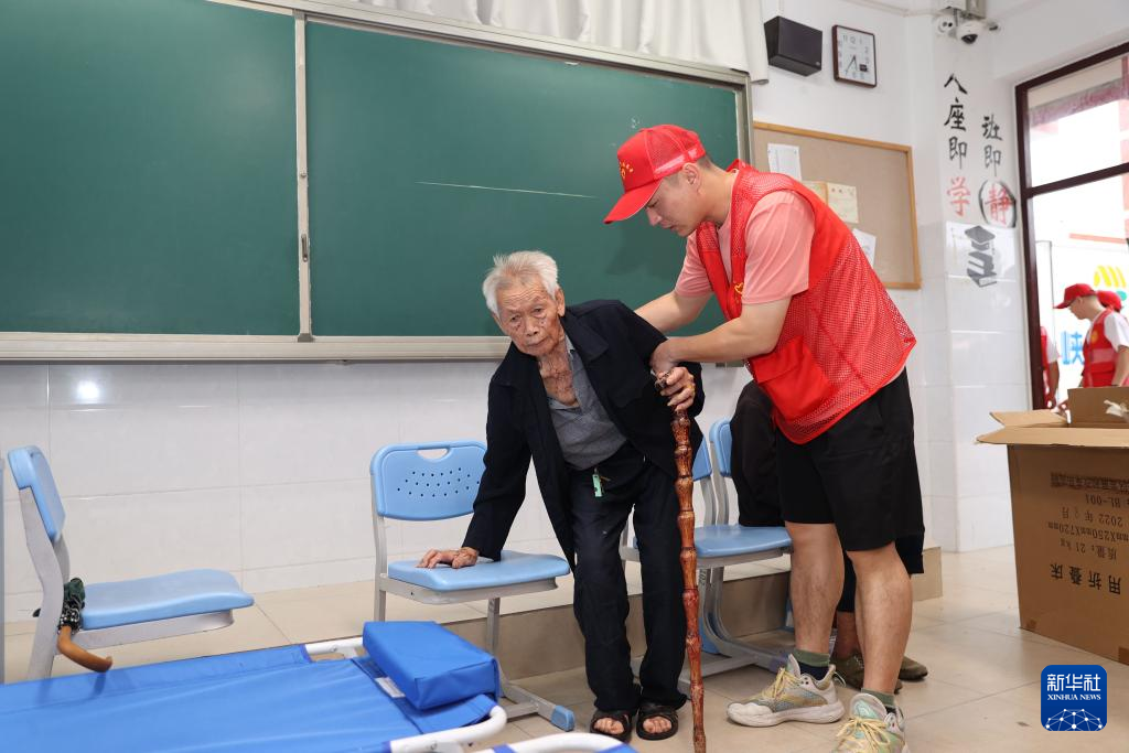7月29日,在福建省厦门市新圩学校临时安置点,志愿者搀扶一名行动不便的老人。新华社发(曾德猛 摄)