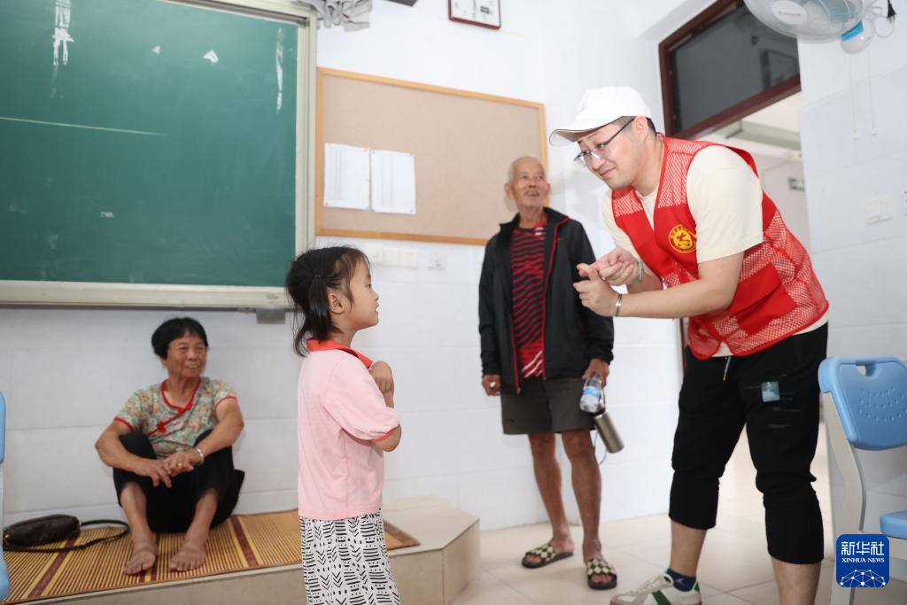 7月29日,在福建省厦门市新圩学校临时安置点,志愿者与被转移安置的小朋友互动。