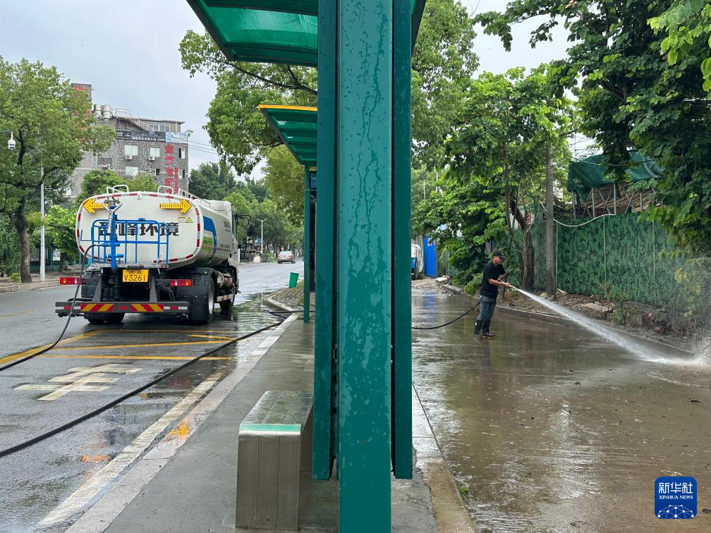 环卫人员正在冲洗路边淤泥。新华社记者 邓倩倩 摄