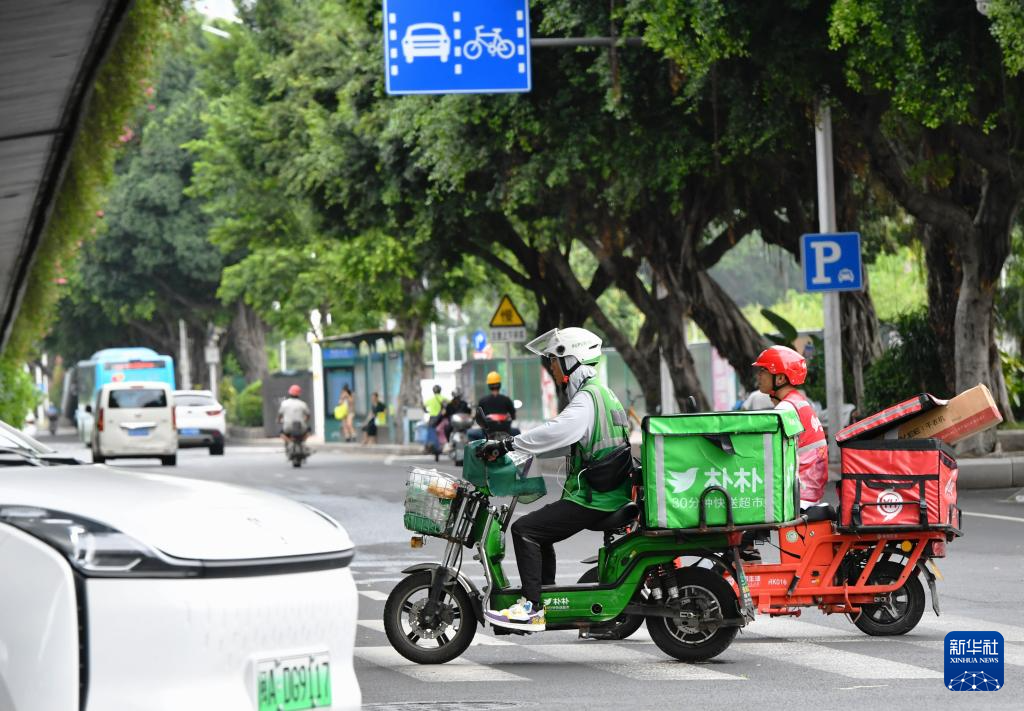 在福州市晋安区连江路上,两名配送员正在送货。新华社记者 魏培全 摄