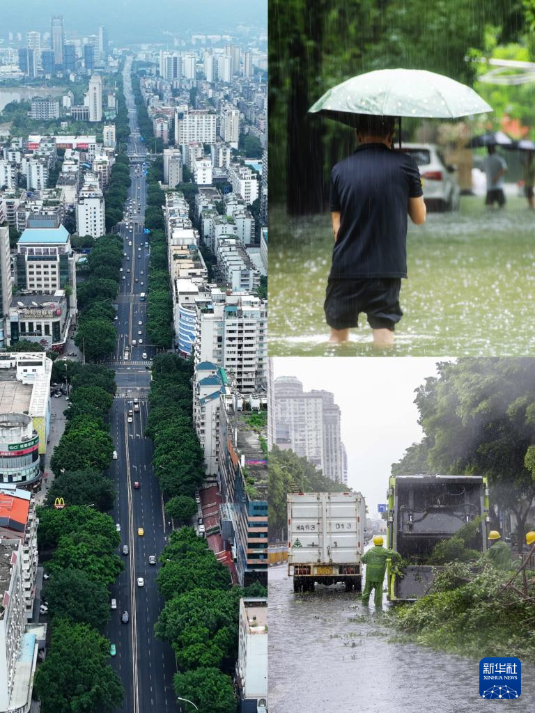 这是一张拼版照片:左图为7月30日拍摄的福州市晋安区福新路,路上积水已退去,交通秩序恢复畅通(无人机照片);右上图为7月29日,位于福州市晋安区福新路上的某小区积水严重,一名市民涉水回家;右下图为7月29日,工作人员在福州市晋安区福新路上清理被台风刮倒的树木。新华社记者 魏培全 摄