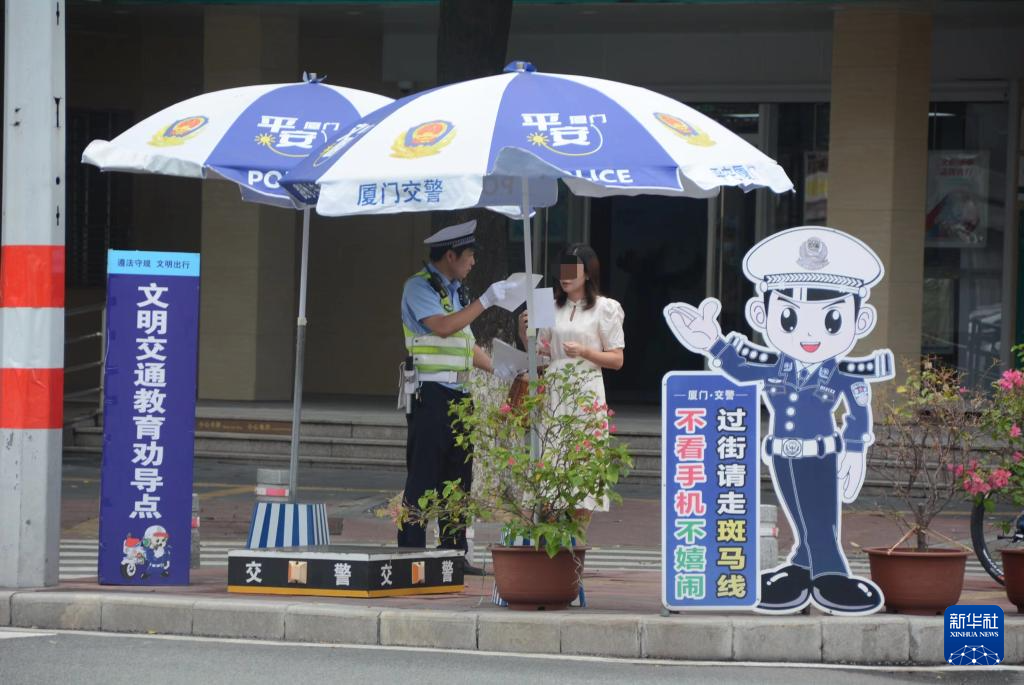 “下次通过斑马线不能再低头看手机了,这次是警告,下次就要处罚您了。”8月1日上午,在位于福建厦门的莲岳路与松柏路交叉口的斑马线前,民警黄坤锋正在教育一位过斑马线时低头玩手机的市民。