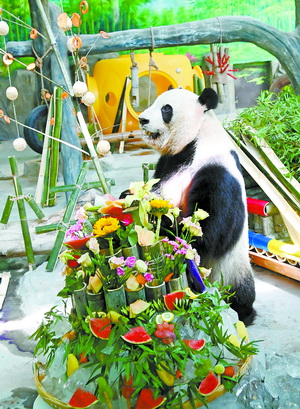 据介绍,本次为大熊猫双胞胎准备的生日玩具“8号赛车”由园区历经一个月精心设计、用竹子打造而成。冰镇生日蛋糕由冰块和竹筒为主体,铺上胡萝卜、苹果、黄瓜、西瓜、哈密瓜等大熊猫爱吃的食物,加以鲜花点缀,制成寓意快乐和美好的竹筒蛋糕。