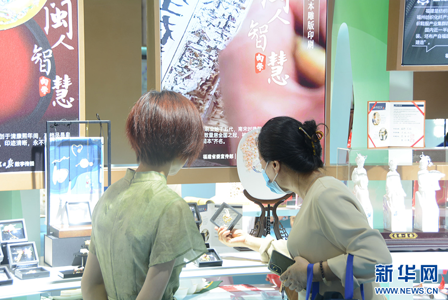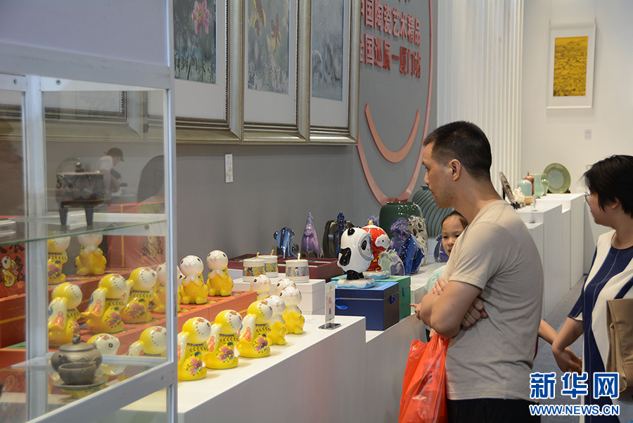 8月4日,在第十四届海峡两岸文博会现场,观众正在端详文创产品。新华社记者 颜之宏 摄