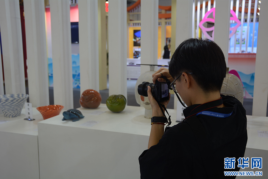 摄影爱好者在第十四届海峡两岸文博会现场拍摄工艺品。新华社记者 颜之宏 摄
